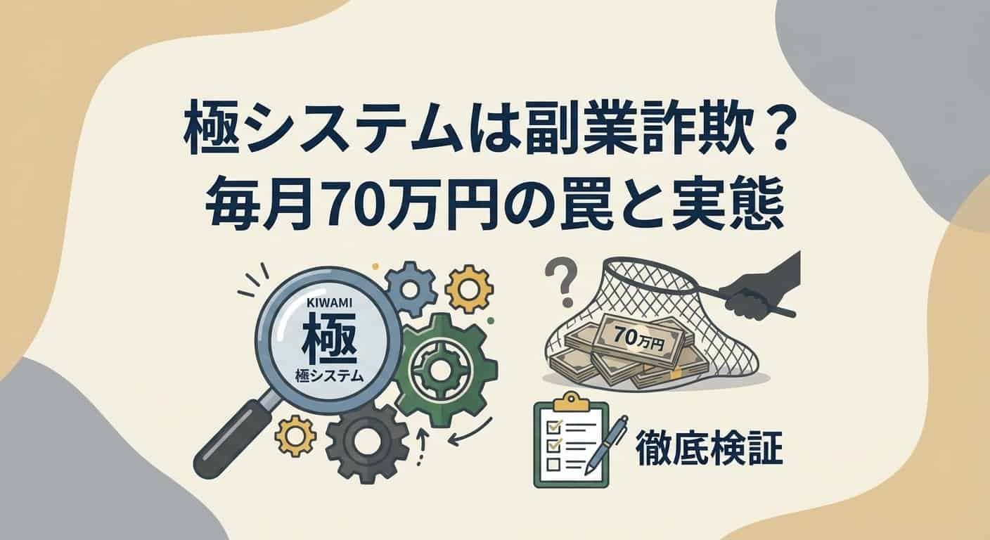 「極システム(KIWAMI)」は、「毎月70万円が完全放置で狙える」と謳うAI自動取引系の副業案件です 。ネット広告やSNSを通じて集客しており、LINE登録を起点としたプロダクトローンチ型の販売手法を使用しています 。最終的には98,000円の高額なシステム利用料・サポート費が請求される仕組みです 。電話番号の記載がなく、LINEをブロックされた時点で連絡手段が完全に途絶える「逃げ得」構造になっている上に返金保証は、条件を満たす事が不可能に近い構造です