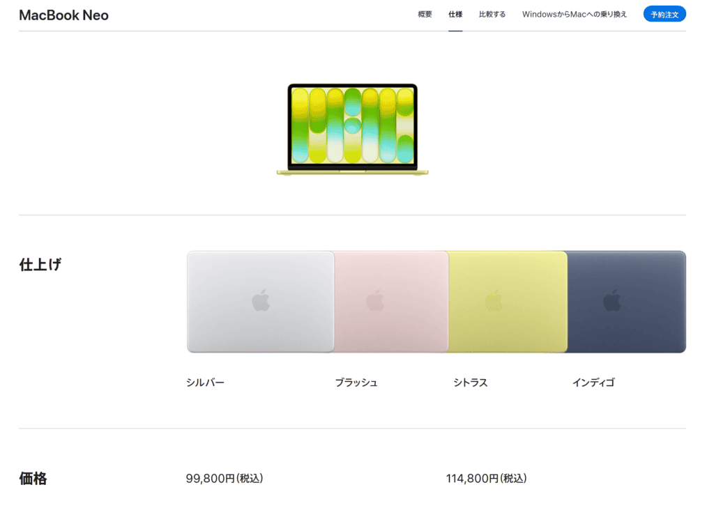 MacBook Neoは2026年3月にAppleが発表した新モデルです。