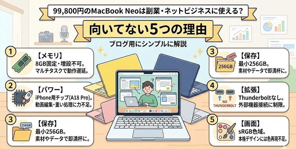 で、ここからが本題。MacBook Neoに限らず、そもそもMacBookがネットビジネスに向いてない理由を話していきます。