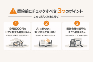 世の中には、中身が空っぽの投資案件や、高額なバックエンドへ誘導するためだけの無料セミナーが溢れています。だからこそ、こうした「一見まともそうに見えるスクール」に対しても、慎重になるのは当然の防衛本能と言えるでしょう。