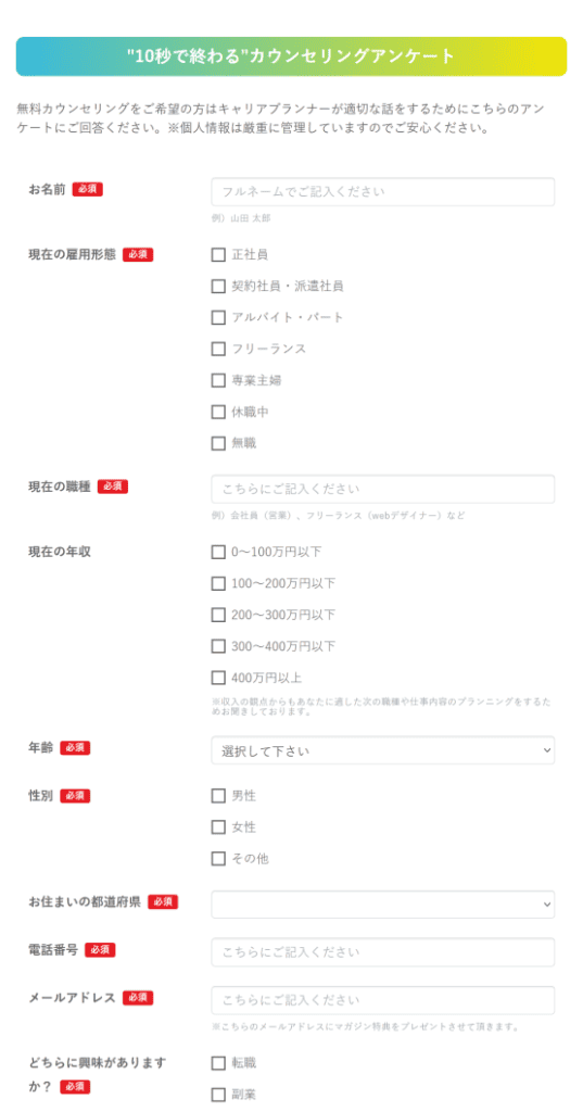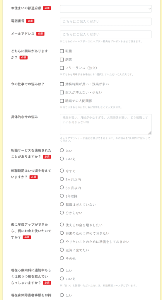 名前、電話番号、メールアドレス、年収、年齢、性別、都道府県、具体的な悩み(記述式)…
