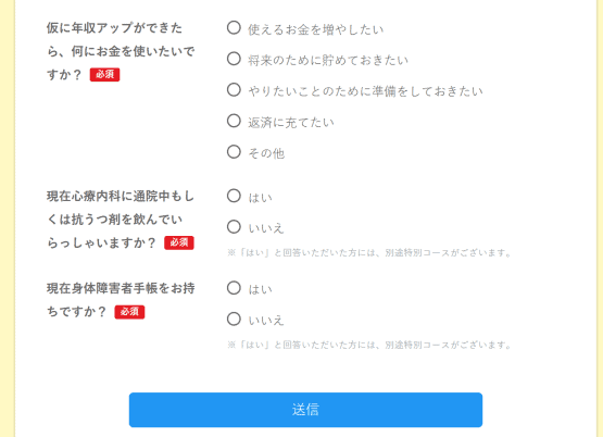 「現在心療内科に通院中もしくは抗うつ剤を飲んでいらっしゃいますか?」 「現在身体障害者手帳をお持ちですか?」